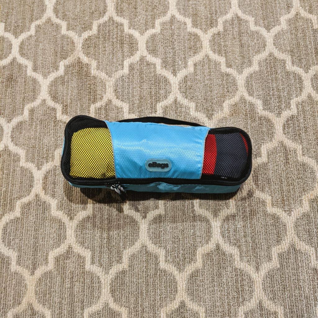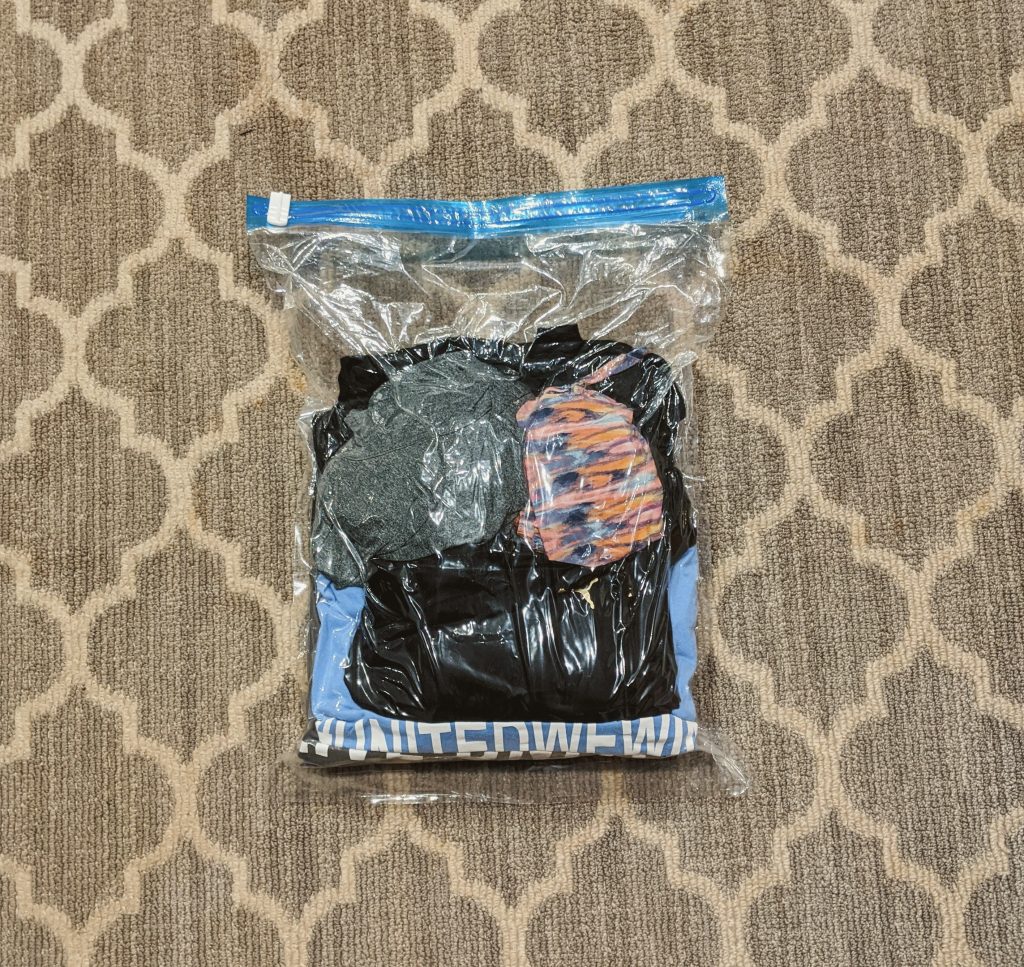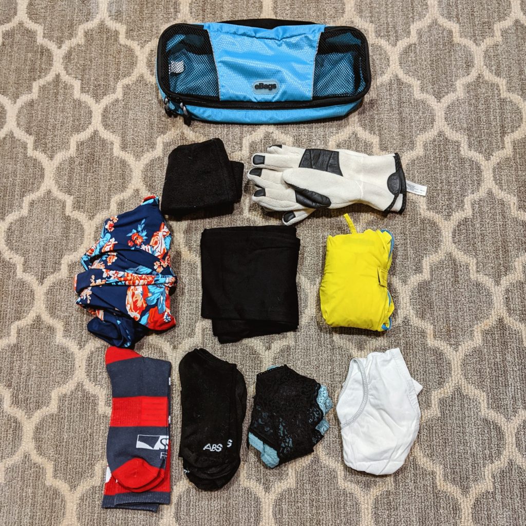 Larger clothes items were compressed them in a small vacuum pack bag. I absolutely love these because you can make your clothes as small as possible. I typically will carry a couple of these bags on a trip (just in cause one stops sealing). Smaller clothes items were packed (read: crammed) into a small packing cube. I included an ultralight rain coat and some cold weather gear for race day.