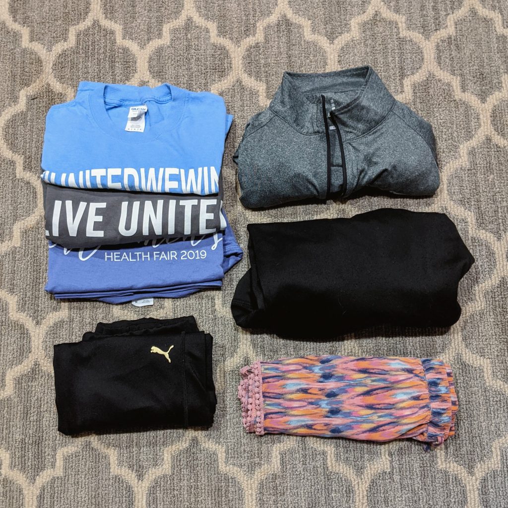 Clothes – Clothes tend to take up the most room in your luggage and vary based on the destination, activities, and weather, so I always start the packing process there. I make a quick list of the days I’ll be gone and the activities planned each day. For this trip, I’m leaving Wednesday and coming back Sunday and have activities ranging from working an expo booth, to social events and cheering our team in the St. Jude Marathon..
